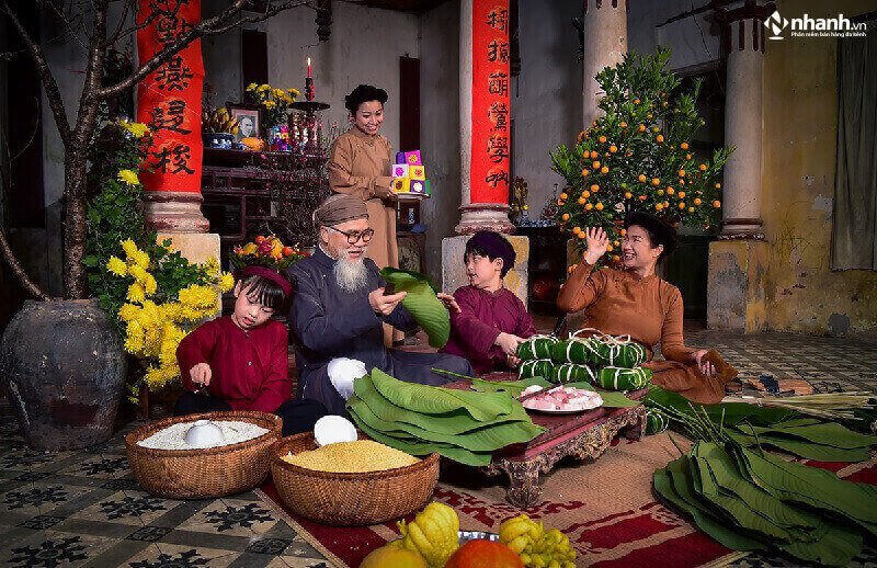 Gói bánh chưng, bánh tét: Hình ảnh cả nhà quây quần bên nồi bánh chưng nghi ngút khói là một biểu tượng đẹp của Tết cổ truyền. Viên bánh vuông vắn tượng trưng cho mặt đất, thể hiện lòng biết ơn của con cháu với trời đất, tổ tiên. Màu xanh của lá dong, vị thơm của gạo nếp, đỗ xanh và thịt mỡ như gói trọn cả một năm lao động vất vả và niềm hy vọng về một năm mới no đủ, viên mãn.
